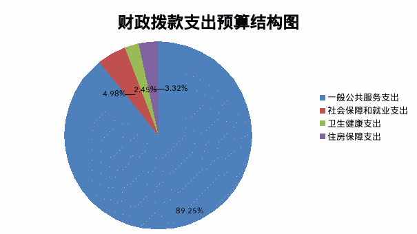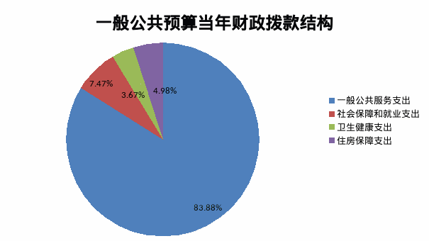 一般公共预算当年拨款20410.68万元,主要用于以下几方面:一般公共服务支出(类)17121.01万元,占83.88%;社会保障和就业支出(类)1524.72万元,占支出的7.47%;卫生健康支出(类)749.12万元,占支出的3.67%,住房保障支出(类)1015.83万元,占支出的4.98%;