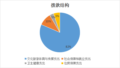 一般公共预算当年拨款18902.86 万元,主要用于以下方面:文化旅游体育与传媒支出15403.91万元,占81.49%;社会保障和就业支出1914.92万元,10.13%;卫生健康支出 614.32万元,占3.25%;住房保障支出 969.71 万元,占5.13%。