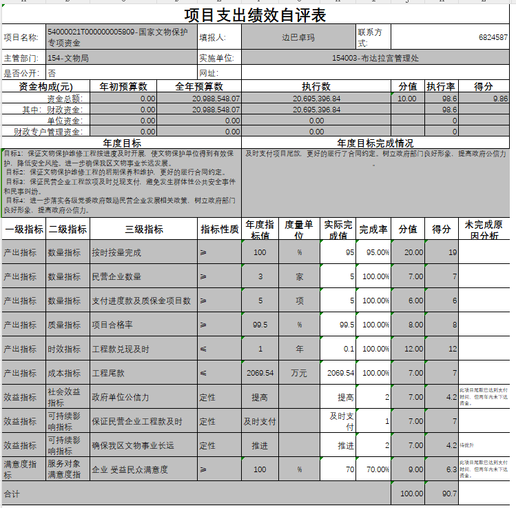 根据年初设定的绩效目标,项目绩效自评得分为100分。全年预算数为1,097万元,执行数为1,017.88万元,完成预算的92.79%。项目绩效目标完成情况:已基本完成罗布林卡一体化综合管理与智慧服务平台建设,包括对一体化管理、智慧服务基础设施及配套设施的建设,对信息设备、资源和数据进行整合,能够有效地将信息化系统中的各类数据有机整合、处理、分析,以智慧化景区为依托,集中建设包括以智慧服务、智慧保护为核心业务系统。