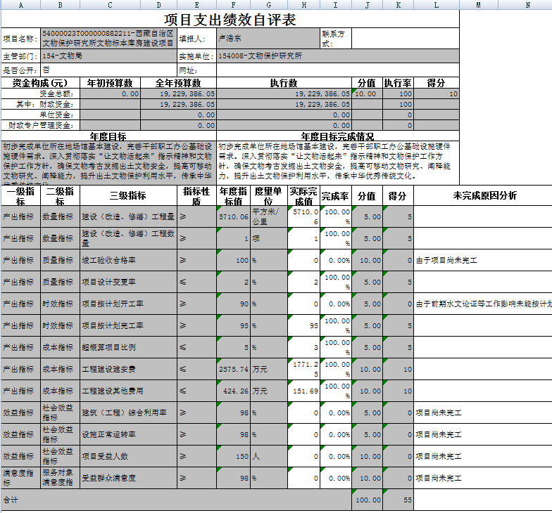 根据年初设定的绩效目标,项目绩效自评得分为100分。全年预算数为2,997.56万元,执行数为1,922.94万元,完成预算的64.15%。项目绩效目标完成情况:初步完成单位所在地场馆基本建设,完善干部职工办公基础设施硬件需求。发现的主要问题及原因:该项目资金一次性下达,而基建项目周期长,无法在一个年度内完成,导致执行进度未达到100%,编制预算时应该按年度编制,资金按年度下达;二是该项目前置手续办理受限,因此导致开工时间延迟。下一步改进措施:今后加强预算编制精细化水平,项目立项时加强与相关部门的沟通协调。